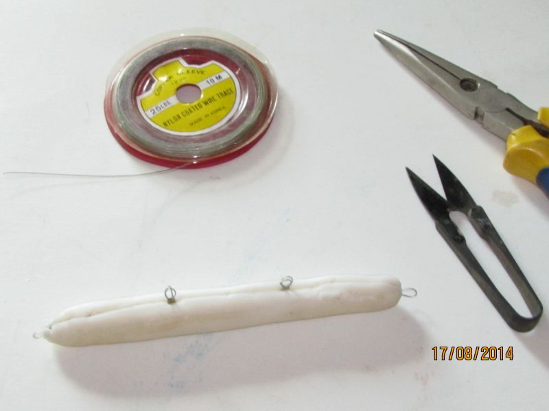 na foto o molde da isca já recebeu a estrutura interna de aço para garatéias.