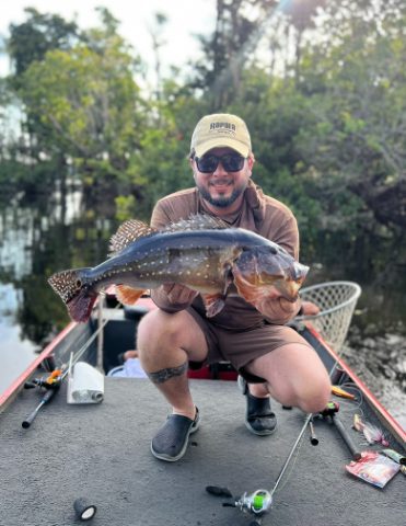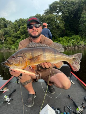 Fala turma, venho relatar mais uma pescaria na Amazônia. Nesse ano de 2024, escolhemos uma operação próxima a Manaus, a Serena Rio Preto Lodge, que se localiza no Rio Preto da Eva. A pescaria foi realizada entre os dias 17/11/2024 a 23/11/2024 E mais um ano seguido a seca extrema atingiu a Amazônia, batendo todos os recordes já registrado de níveis de rios secos, em algumas regiões como Juma, Mutuca e Pantaleão, várias operações foram obrigadas a cancelar suas semanas de pesca. Chegando em Manaus como sempre avistamos o gigante Rio Negro, que nesse ano estava bem seco ! Nesse momento já sabíamos que não seria uma pescaria fácil. Vista: Rio Negro - AM A logística até a pousada é bem simples, saímos de Manaus por volta das 10:00 horas, aproximadamente as 13:30 paramos no município de Rio Preto da Eva para almoçar. Após o almoço embarcamos novamente no ônibus, pegamos uma estrada de chão até o ramal onde os barcos estavam nos esperando. Do ramal até a pousada levamos aproximadamente 20min, chegando na pousada por volta das 16:30 Esse ano nossa turma estava bem grande, com 19 homens e 03 mulheres totalizando 22 pescadores. A pousada Serena é muito boa, com quartos confortáveis, uma ótima alimentação e barcos excelentes, todos plataformados e com motores 30hp, que fazem a diferença na hora de ir de um ponto ao outro. Infelizmente pegamos um rio bem torrado, em vários pontos conseguíamos ver todas as estruturas para fora do rio, mesmo com esse cenário conseguimos fazer uma pescaria relativamente boa. Existem muitos pontos bons próximo a pousada, inclusive no deck da pousada um pescador capturou um peixe de 65cm. E bem em frente à pousada outro pescador embarcou um peixe de 78cm bem na hora do almoço, pensa a festa. A pescaria foi muito ralada, mas diante desse senário de rio extremamente seco, volto a dizer que fizemos uma pescaria relativamente boa,. Como de costume, todo ano fazemos nosso torneio de pesca, esse ano só eram validados os peixes acima de 50 cm. No total foram embarcados, medidos e filmados 89 peixes 50up. 80up – 01 Peixe 70up – 10 Peixes 60up – 26 Peixes 50up – 52 Peixes Com certeza voltaria ao Serena, é um rio com grande potencial e muito próximo a Manaus, diferente do Mutuca e Juma, o Rio Preto da Eva ainda não tem tanta pressão de pesca. Infelizmente pegamos a pior seca da história da Amazônia, não foi uma temporada de pesca fácil. Mas acredito que são essas as situações que fazem a pescaria na Amazônia serem totalmente desafiadoras e gratificantes ao mesmo tempo.