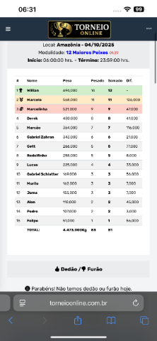 Fala, turma! Venho relatar mais uma pescaria. Dessa vez, foi na região de Barcelos, a bordo do Barco Marruá. Nossa pescaria foi realizada entre os dias 04/10/2025 e 10/10/2025. Depois de dois anos consecutivos enfrentando secas extremas na Amazônia por causa dos efeitos do El Niño, é muito bom chegar e ver o Rio Negro assim, voltando ao seu nível normal. OUTUBRO DE 2025 NOVEMBRO DE 2024 O nível do Rio Negro, em Barcelos, ainda estava um pouco alto. Nosso objetivo era subir o Aracá ou o Demeni, mas ambos os rios estavam cheios de barcos-hotel. Até então, eram os dois que apresentavam as melhores condições. Três dias antes da pescaria, saiu um peixe de 86 cm no Demeni, o que certamente atrairia ainda mais turmas para lá. Em conversa com o pessoal do Marruá, decidimos mudar os planos: subir o Negro em direção a Santa Isabel do Rio Negro e pescar mais acima. Chegando em Barcelos, já era possível avistar algumas praias surgindo ao longo do rio — um sinal animador que elevava nossas expectativas e deixava o pescador ainda mais ansioso. Assim que chegamos, embarcamos no Marruá. Um almoço rápido e, sem perder tempo, já estávamos na água, prontos para viver mais uma aventura amazônica. Logo nas primeiras horas de pesca, já embarquei três peixes na hélice — o que anima qualquer pescador. Na subida, optamos por dormir na boca do Arirarrá e, bem cedo, entrar no rio para pescar. Porém, não foi uma boa escolha: passamos a manhã toda dentro do Arirarrá sem ver um único peixe. Paramos para o almoço, pegamos aquela típica chuva torrencial da Amazônia e decidimos voltar para o rio Negro. Por lá, embarcamos alguns peixes, mas a pescaria continuava difícil — até que um belo exemplar entrou na sarará e levou a garateia com pitão e tudo! A Amazônia nunca é fácil, mas sempre surpreende! Hahaha Continuamos subindo o rio Negro, e a pescaria seguia difícil. Ainda assim, vários peixes na faixa de 50 a 60 cm estavam entrando — e o melhor, quase todos na hélice. O troféu ainda não havia aparecido, mas encontramos um bom cardume que garantiu a diversão. Seguimos a pescaria nesse ritmo: muito peixe de pequeno porte na hélice, garantindo a diversão, mas ainda faltava aparecer o grande. Até que vimos um peixe enorme caçando. Joguei para um lado, o Marcelo lançou para o outro — e lá estava ele, o gigante entrou! Mas, como sempre digo, a Amazônia nunca é fácil. Peixe grande é ainda mais difícil, e dessa vez quem não aguentou foi o snap. Cara, é triste demais ver a expressão de quem perde um troféu! Kkkkkkkk Mas faz parte — a pescaria segue. E o pior é que sempre fazemos nosso tradicional torneio… então perder um peixe desse tamanho é, literalmente, perder um troféu! Nossa pescaria seguiu nesse ritmo. Subimos mais um pouco e encontramos alguns peixes maiores. Meu destaque foi um belo paca de 70 cm. Continuei embarcando muitos peixes na hélice, o que me manteve na liderança do torneio. O pessoal acabou perdendo pelo menos uns cinco peixes grandes, que acreditamos serem os tão afamados 80up. Os quatro maiores peixes da semana mediram 79, 76, 74 e 70 cm. No nosso torneio, só são válidos peixes acima de 50 cm — e esses foram os números da nossa turma, composta por 15 pescadores: 50up = 89 peixes 60up = 26 peixes 70up = 4 peixes Total = 119 peixes embarcados Peguei muitos peixes na hélice, somando ótimos pontos para o torneio, o que me rendeu o troféu de melhor pescador. A isca que marcou minha pescaria foi a High Roller 6.25 Não posso deixar de destacar o barco Marruá: excelente custo-benefício em Barcelos. O atendimento é nota 10; os proprietários estão sempre junto com o grupo, os guias são experientes, o barco é confortável e a comida e as bebidas são de primeira. Com certeza pretendo voltar — e recomendo! -