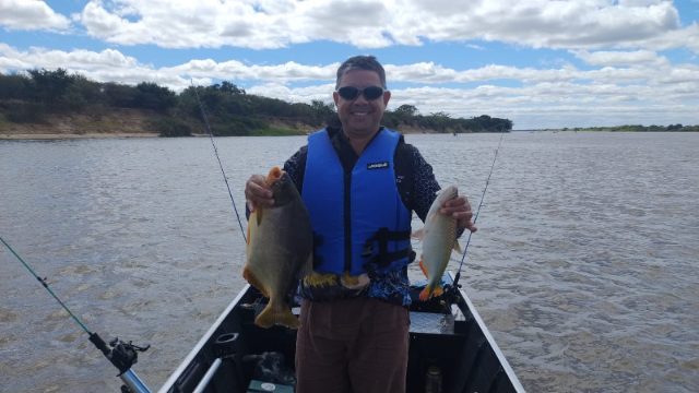 Minha Turma: Turma do Charles 2025 - Ano XV- Loal: Carinhanha - Bahia - Pousada do Ramiro Data: 17 a 24 de Maio de 2025. Saímos de Lagoa da Prata - MG e fomos em busca da aventura no Rio São Francisco, na Bahia, onde, já havíamos pescado em 2024 e com um bom número de ações e capturas. Desta vez ficamos na Pousada do Ramiro (77 9 9973 9046) - Muito arrumada, com quarto para 02 pescadores, todos com ar, banheiro privativo, grande área de lazer e piscina, para que tenhamos o máximo conforto e ficando apenas uns 50 metros do rio. Lá alugamos os motores que faltaram e todos os barcos - desde que avisado com antecedência, o Ramiro providencia tudo. Chegamos com água meio suja e rio alto, este ano as pescarias no São Francisco foram difíceis, hora é vento, hora rio subindo, hora frio, hora seca etc... Começamos a pescaria e nos 02 primeiros dias pescamos no rio Carinhanha, que desagua no São Francisco e dá nome ao local, rio de águas limpas e com boa profundidade, porém com muitos roubadores de iscas e poucos peixes de maior emoção; ressaltando as iscas utilizadas lá: MILHO AZEDO, BOLINHA DE MASSA COM SABORES (MARACUJÁ E MORANGO), TUVIRAS, LAMBARIS, ISCAS ARTIFICIAIS (CORRICO), SALSICHA, CARAMUJO E CARANGUEIJO. MATERIAIS: ANZOIS CHINUS - 5,6,7,8 - Encastoado com arame de aço liso pequeno: 2 a 3 cm, pesquei muito com anzóis duplos e com chicotes - melhorou bem a eficiência - PEIXES: Piavuçú, Piapara, Pacu Prata, Pacu Caranha (alguns de até 8 kg), piau cabeça gorda e piau 3 pintas. ANZOIS: 5/0 com Tuviras e Lambaris (pegos no rio com tarrafa) - Para pesca de rodada (barco solto), rodadinha (barco apoitado) e de espera: Dourado (pegamos alguns pequenos) e Pintado (surubin) - só 01 pequeno ISCAS ARTIFICIAIS: 90% no corrico - Iscas de Barbela Longa - 13 cm em média - pegamos Dourados de bom tamanho Voltando; depois no terceiro dia o Rio abaixou e a água já estava limpando há vários dias - já estava numa cor melhor, ai pescamos no São Franscisco. Capturamos alguns dourados no corrigo e na rodadinha, pegamos umas CARANHAS DE BOM TAMANHO, piaus e piaparas foram poucos, mais a pescaria lá é de Paciência e Espera, muitas vezes de 02 horas num único local, o sol não perdoa e não tem sombra, pois o rio tem até 1 km de largura. Arodadinha foi boa para piaus e piaparas e as Caranhas pegaram bem no milho e na salsicha - mas só na espera. Ano que vem iremos em Maio no Carinhnha novamente, pescaria de Casais e de homens em Porto Murtinho em Setembro. Algumas imagens da aventura! -